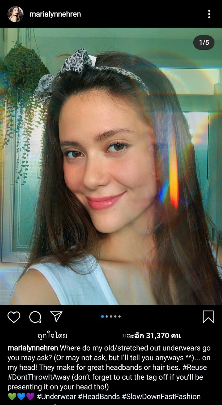 เมื่อวันอังคารที่ผ่านมา (27 ก.ค.) นางสาวมารีญา ที่ชนะการประกาดมิสไทยแลนด์ยูนิเวิร์ส 2017 โพสต์รูปที่ตนรียูสกางเกงในเป็นที่คาดผมลงในอินสตาแกรม พร้อมกับติดแฮชแท็ก #ReuseDontThrowItAway หรือนำมาใช้ใหม่อย่าทิ้ง