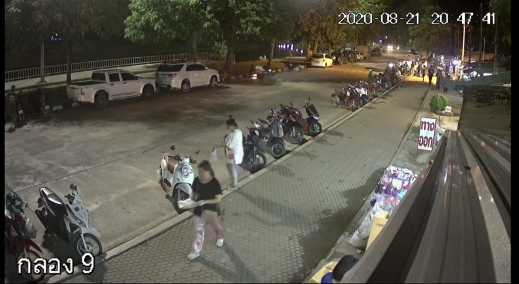 หลังจากนั้นตน ได้เดินทางเข้าไปขอเปิดดูกล้องวงจรปิดที่ร้านขายพลาสติกตรงข้ามกับรถจักรยานยนต์ที่จอดไว้ เพื่อดูว่าใครเป็นคนขโมยไป โดยในกล้องวงจรปิดก็เห็นภาพคนร้าย เดินวนไปวนมารอบรถผู้เสียหายอยู่หลายรอบ ทำท่าที่มีพิรุธ และหลังจากนั้นก็ได้หยิบกระเป๋านักเรียนใบเล็กและกระเป๋าเสื้อผ้าใบใหญ่ไป พร้อมกับขับขี่รถจักรยานยนต์หนีหายไป